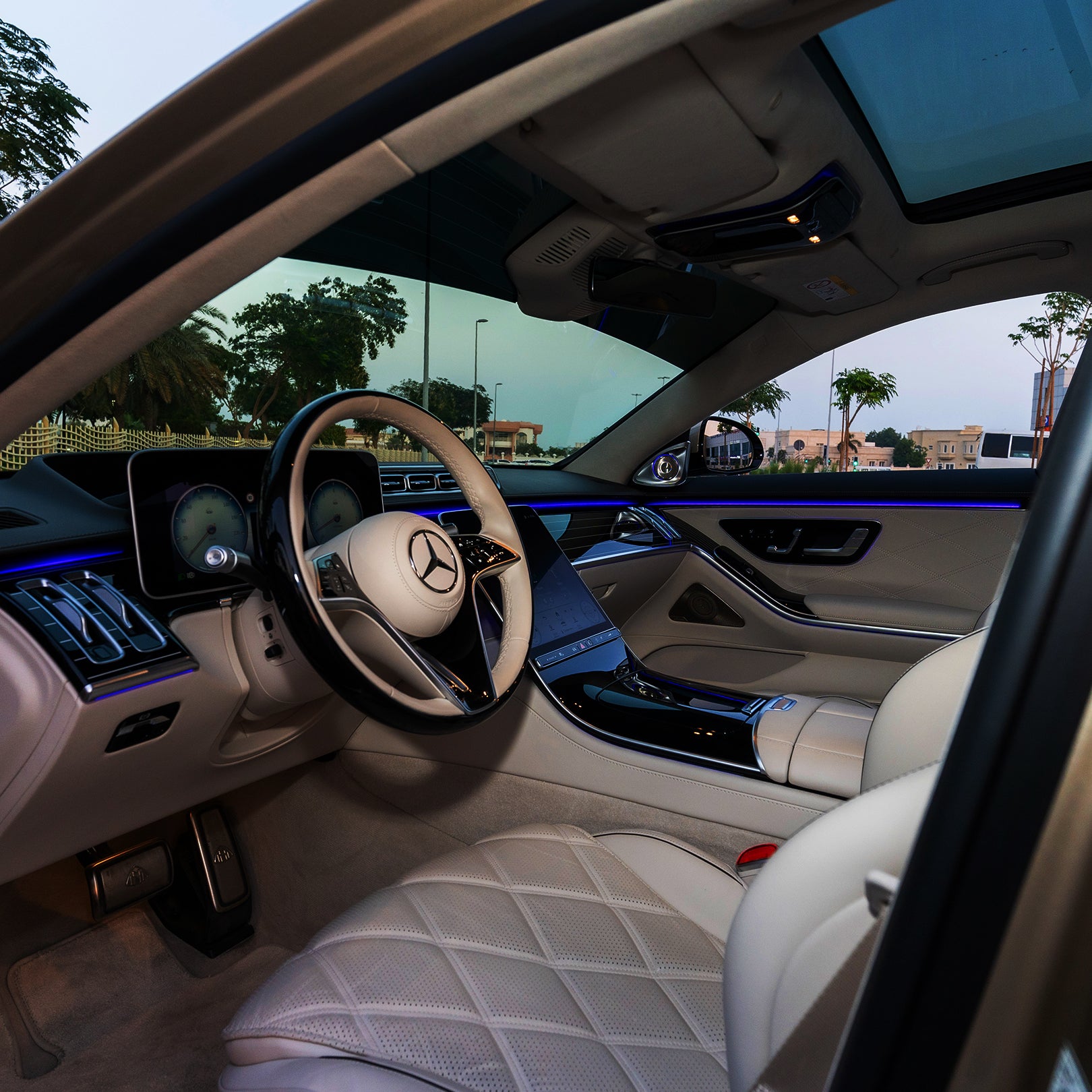 Mercedes S680 Maybach, el işçiliğiyle üretilmiş detayları, first-class konforu ve güçlü V12 motoruyla Dubai’nin en prestijli sedanıdır.